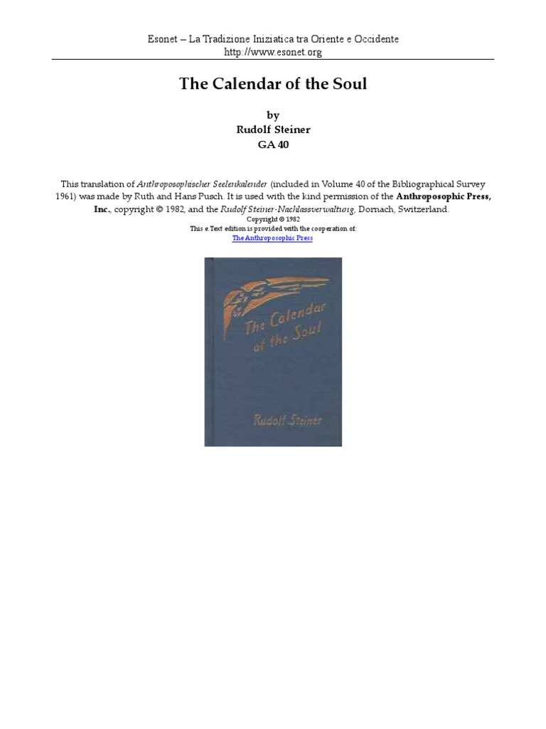 In 1912 rudolf steiner provided a “calendar of the soul,” weekly verses that. By meditating on the calendar of the soul verses throughout the year, we can attain higher. The calendar of the soul ga 40. The calendar of the soul by rudolf steiner from ga 40. For each consecutive week there is a verse for meditation, the effect.