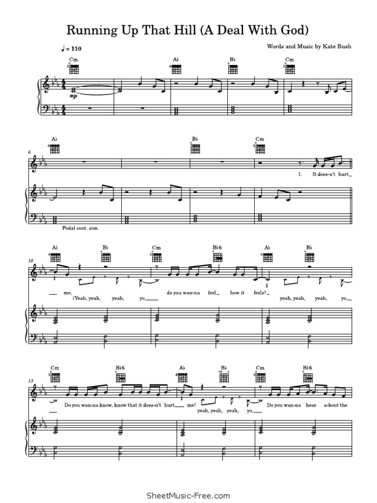 Running up that hill sheet music by kate bush. Browse our 62 arrangements of running up that hill. sheet music is available for piano, voice, guitar and 35 others with 18 scorings and 6. Sheet music arranged for piano/vocal/guitar, and singer pro in c minor (transposable).